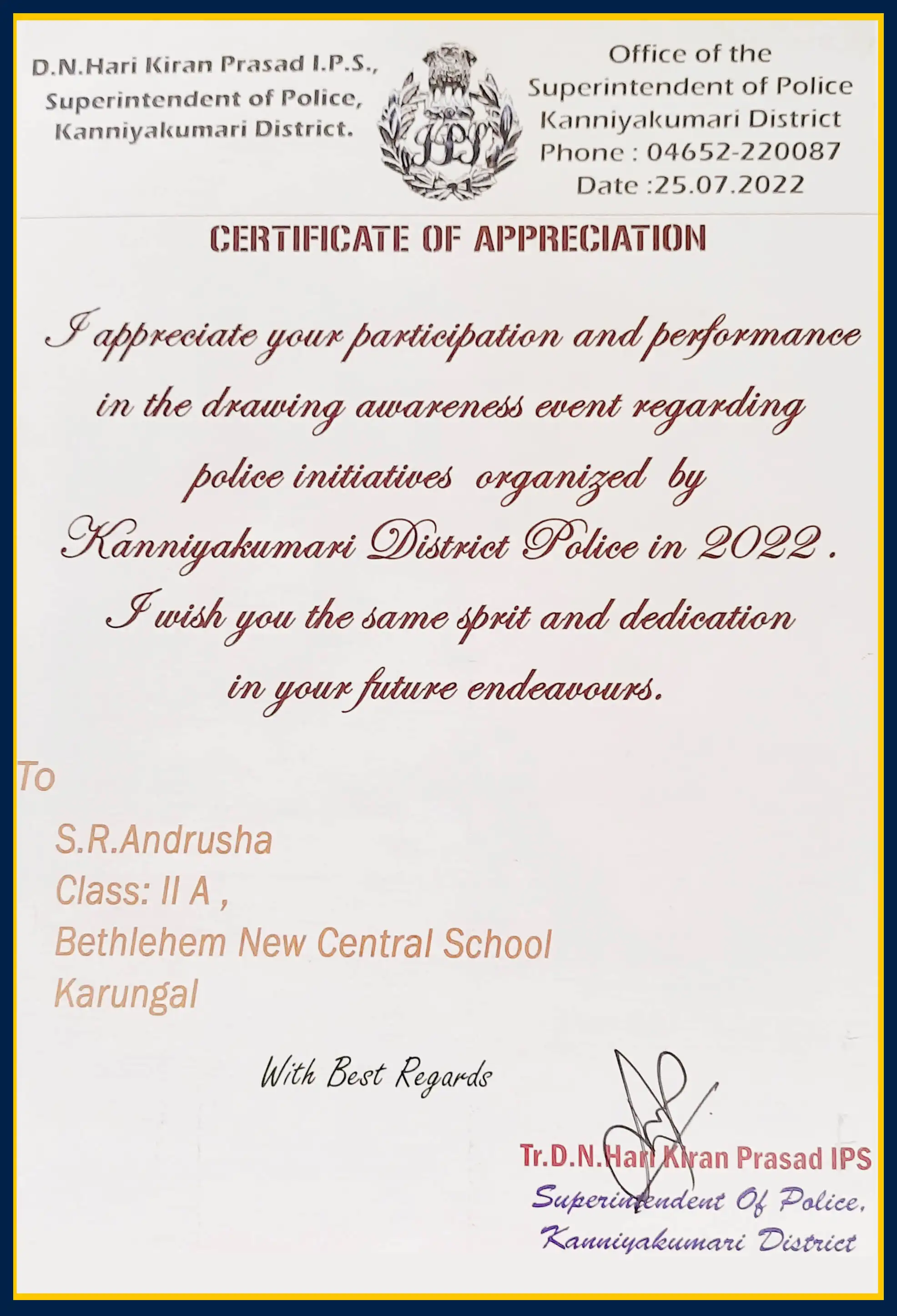 One of our students won Appreciation Certificate from Superintendent of Police, Kanyakumari District. Its out of more than 3000 school and college students were participated in that Drawing Awareness event regarding Police Initiatives. Ten were selected. Our grade one student also one among them by God's grace.